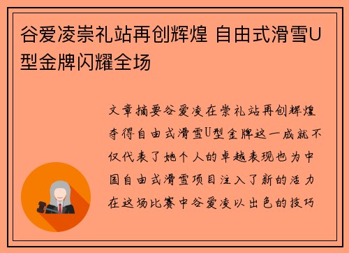 文章摘要:谷爱凌在崇礼站再创辉煌,夺得自由式滑雪U型金牌,这一成就不仅代表了她个人的卓越表现,也为中国自由式滑雪项目注入了新的活力。在这场比赛中,谷爱凌以出色的技巧和勇敢的挑战,征服了赛道上的每一道难关,最终成功斩获金牌,成为全场焦点。她的表现不仅展现了个人技术的高度,还证明了她在竞技体育中的不屈精神和超凡的心理素质。本文将从四个方面详细阐述谷爱凌如何在崇礼站的比赛中再创辉煌,分别从她的赛前准备、比赛表现、技术亮点以及比赛后的反响等方面进行详细分析,呈现谷爱凌如何闪耀全场,并为中国自由式滑雪项目树立新的标杆。